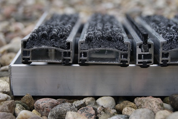 - Zatrzymuje brud w przestrzeniach pomiędzy profilami poprzez działanie szczotki liniowej umieszczonej powyżej płaszczyzny filcu i absorbuje nawet do 80% wilgoci z obuwia dzięki uwypuklonej powierzchni filcu.