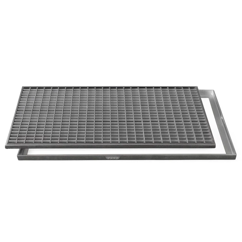 Rama wokół kratki tworzy „wanienkę”, która zatrzymuje brud i wodę pod kratą, a jednocześnie ułatwia licowanie wycieraczki z nawierzchnią z kostki, posadzką lub wylewką betonową. To wygląda estetycznie, chroni krawędzie posadzki przed wykruszaniem i stabilizuje ułożenie wycieraczki. Kratka ma możliwość wyjęcia — można ją unieść, szybko wymieść/odkurzyć nieckę i włożyć z powrotem. Dostępne są ramy o wysokości 20 mm, 70 mm oraz skrzynie z tworzywa sztucznego.