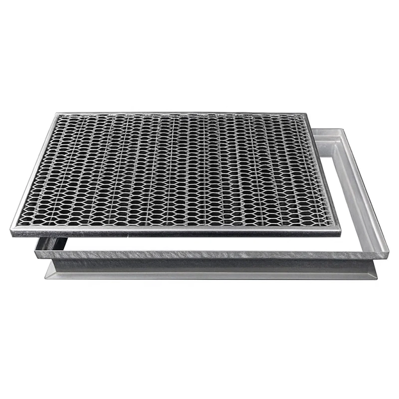 Wycieraczka metalowa, ocynkowana w ramie metalowej. Wycieraczka o zwiększonej ilości oczek oraz o zmienionym kształcie otworów co maksymalizuje ilość wnoszonego brudu i zanieczyszczeń wyłapywanych przez wycieraczkę.