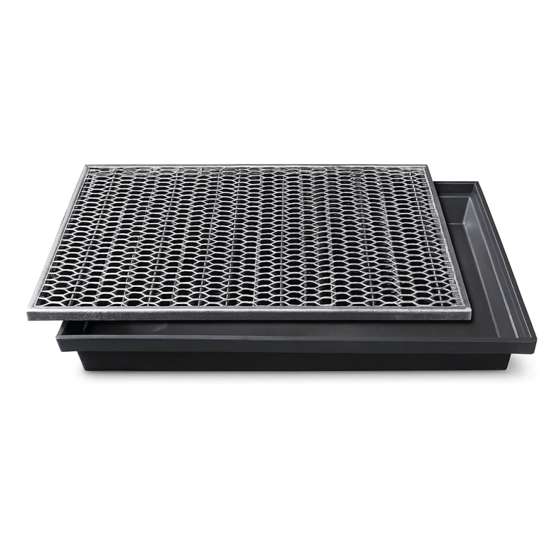 - Wycieraczka metalowa, ocynkowana w ramie metalowej. Wycieraczka o zwiększonej ilości oczek oraz o zmienionym kształcie otworów co maksymalizuje ilość wnoszonego brudu.