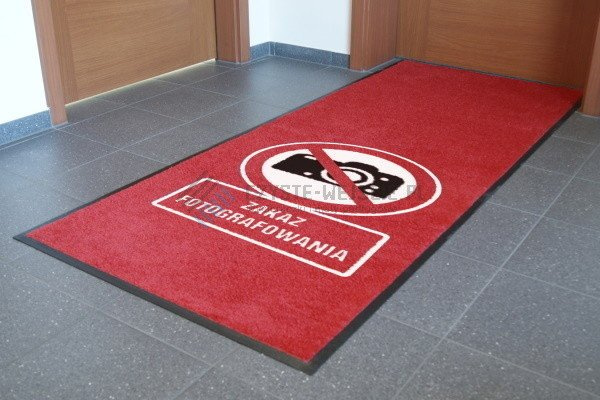 Mata tekstylna, która może pełnić również funkcję wycieraczki, z piktogramem "Zakaz fotografowania" i opisem. Możemy przygotować matę z innymi znakami, w tym celu prosimy o kontakt z nami.
