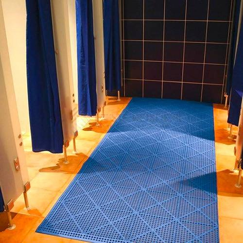 Komplet zawiera 9 sztuk płytek podłogowych z elastycznego i higienicznego PVC stosowanych w obszarach basenowych, natryskach, przebieralniach oraz szatniach. Redukują one ryzyko poślizgnięcia na mokrych powierzchniach. Otwory w płytce oraz wypukłości na spodzie wspomagają skuteczne odprowadzanie wody. Teksturowana górna powierzchnia zapewnia komfort chodzenia bez obuwia. Wystarczy ją zwinąć w celu umycia podłogi i umyć matę wodą.