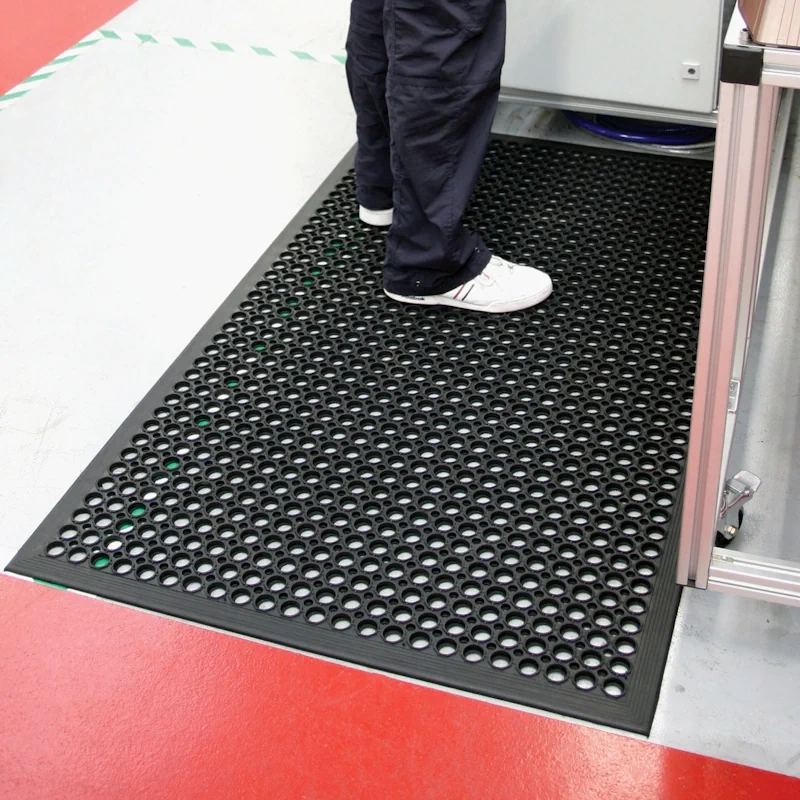 Uniwersalna mata gumowa Rampmat , która sprawdza się zarówno jako wycieraczka do wejścia, jak i ergonomiczna mata do pracy stojącej. Dzięki ażurowej powierzchni skutecznie zatrzymuje zanieczyszczenia, a jednocześnie zapewnia amortyzację i komfort użytkowania w miejscach, gdzie konieczne jest długotrwałe stanie.