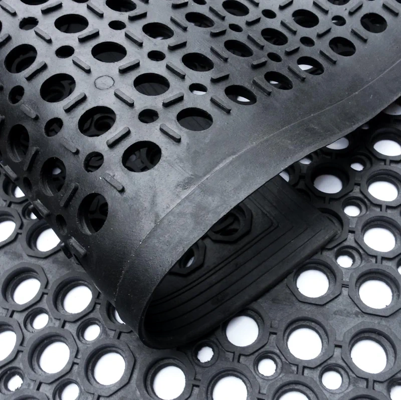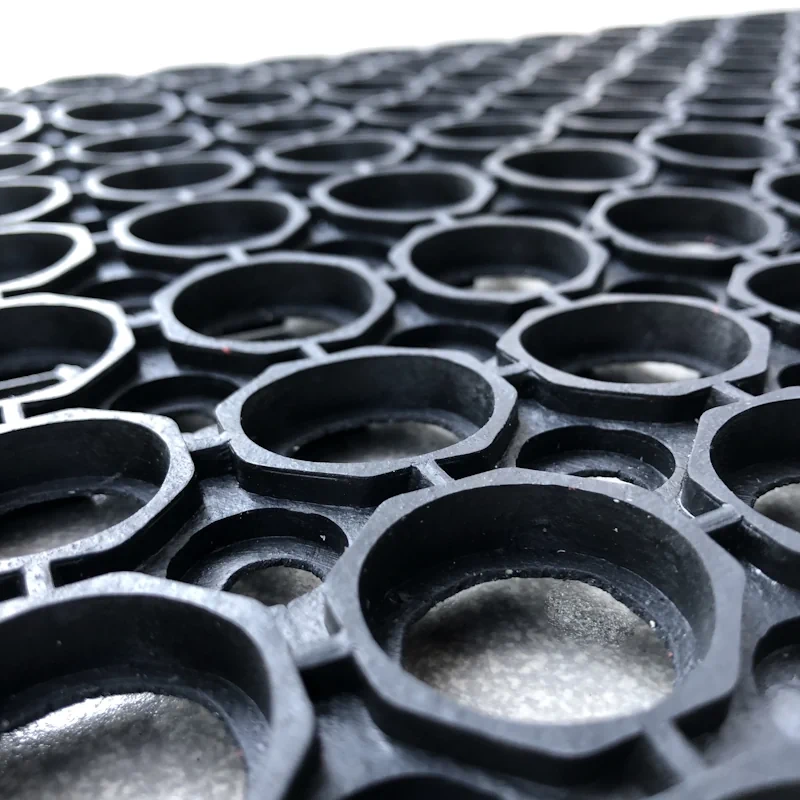 Wycieraczka ażurowa wykonana z trudnościeralnej gumy, odpornej na warunku atmosferyczne.  Zapewnia właściwości antypoślizgowe, najazd zapobiega potknięciom, oraz umożliwia bezpieczny przejazd wózków przez wycieraczkę. Dzięki gumowej strukturze zapewnia dobrą przyczepność na śliskich powierzchniach. Doskonała do użytku zewnętrznego – przed wejściem do budynków, w miejscach o dużym natężeniu ruchu, takich jak sklepy, restauracje, czy zakłady przemysłowe.