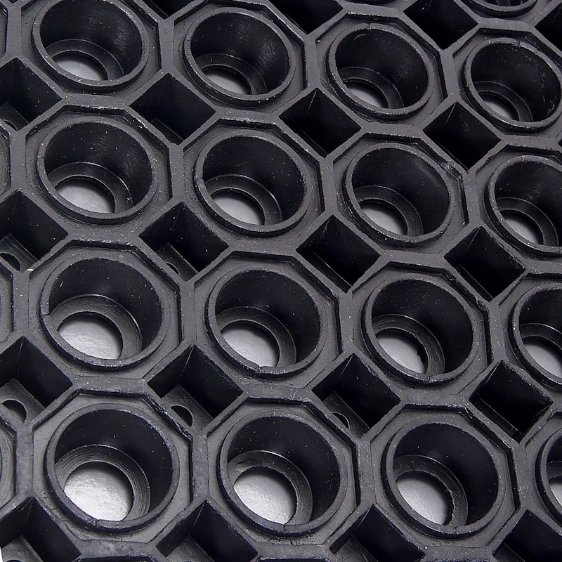 Trwała i wytrzymała mata gumowa typu plaster miodu  do zastosowań w miejscach o dużym natężeniu ruchu. Dzięki ażurowej konstrukcji skutecznie zatrzymuje zanieczyszczenia i błoto, a otwory umożliwiają odprowadzanie wody oraz śniegu. Wykonana z odpornej na ścieranie gumy, gwarantuje stabilność oraz długi okres użytkowania nawet w trudnych warunkach.