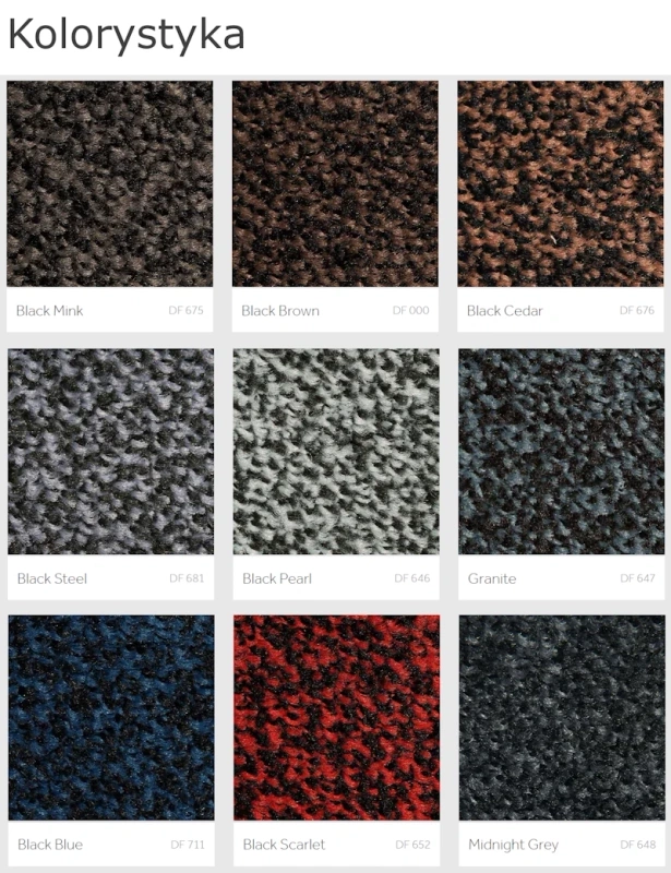 Dzięki barwieniu włókien w masie kolory pozostają intensywne nawet po wielu cyklach prania. Mata sprawdzi się w strefach wejściowych i przejściach — od biurowców i hoteli po obiekty handlowe i medyczne.
