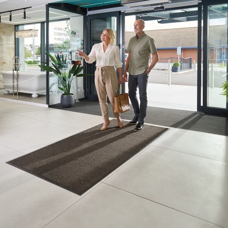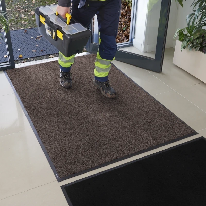 Dzięki barwieniu włókien w masie kolory pozostają intensywne nawet po wielu cyklach prania. Mata sprawdzi się w strefach wejściowych i przejściach — od biurowców i hoteli po obiekty handlowe i medyczne.